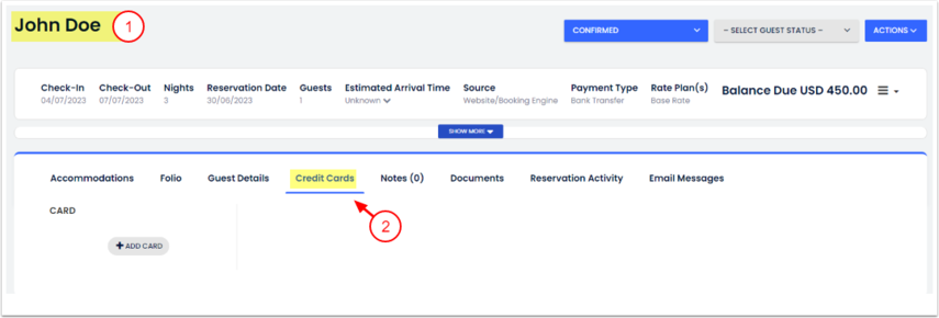 Kredi kartları sekmesi, Rezervasyon Detayları içinde, kullanıcıların misafirin kredi kartlarını eklemesine ve yönetmesine olanak tanır. Bu makale, misafirin kredi kartı bilgilerini rezervasyona manuel olarak nasıl ekleyeceğini adım adım veya Cloudbeds Terminal kullanarak nasıl ekleyeceğini açıklar.