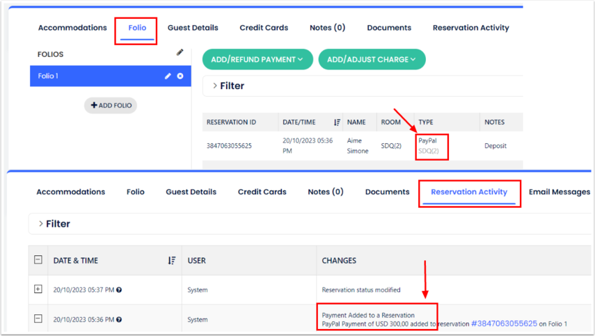 - PayPal'da ödemeyi kabul ettiğinde, ödeme misafirin folyosuna otomatik olarak işlenir ve rezervasyon durumu Cloudbeds PMS'de otomatik olarak Onaylandı olarak güncellenir.