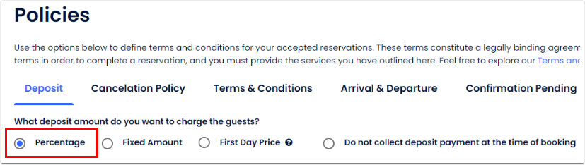 - Cloudbeds PMS'de Politikalar bölümünde, Çevrimiçi rezervasyonlar için, rezervasyon onaylanmadan önce depozito ödemesinin onaylanmasını gerektir seçeneği aktiftir. Bu, Rezervasyon Motorunda yapılan her rezervasyonun, depozito ödemesi doğrulanana ve rezervasyon durumu Onaylandı olarak manuel değiştirilene kadar Onay Bekliyor durumunda olacağı anlamına gelir.