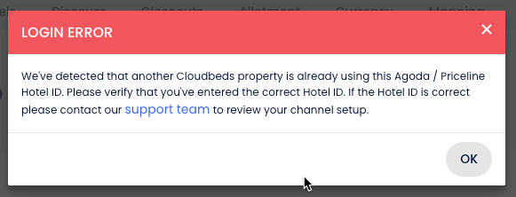 "Başka bir Cloudbeds tesisinin bu Agoda / Priceline Otel Kimliğini zaten kullandığını tespit ettik. Lütfen doğru Otel Kimliğini girdiğini doğrula."