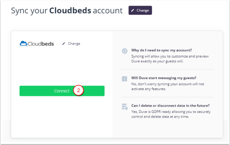 - Birden fazla Cloudbeds hesabın varsa, hesapları eşitleme sırasında ilgili Cloudbeds hesabına giriş yapmış olmalısın. Bu, aynı bilgilerle iki hesabın olmasını engeller.