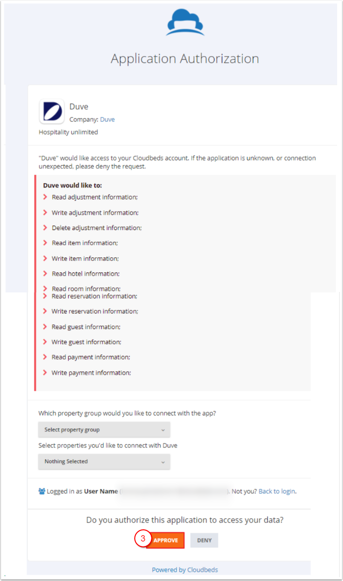 - Duve seni Cloudbeds PMS hesabına yönlendirecek ve entegrasyonu onaylamanı isteyecek. Onayla butonuna tıkla.