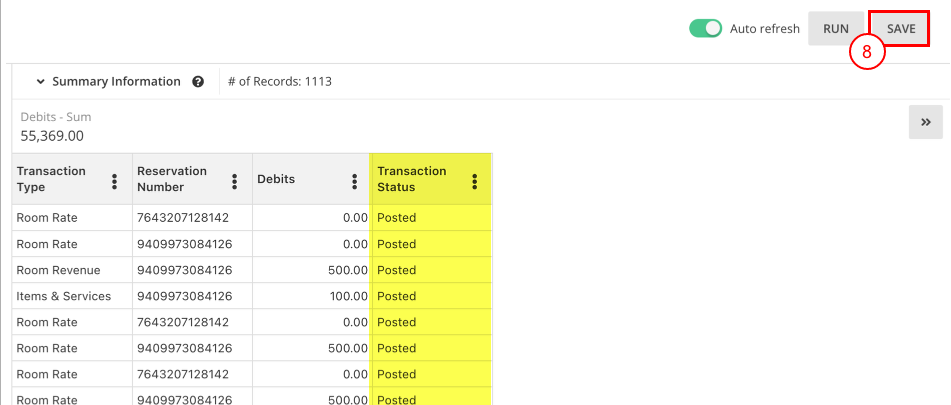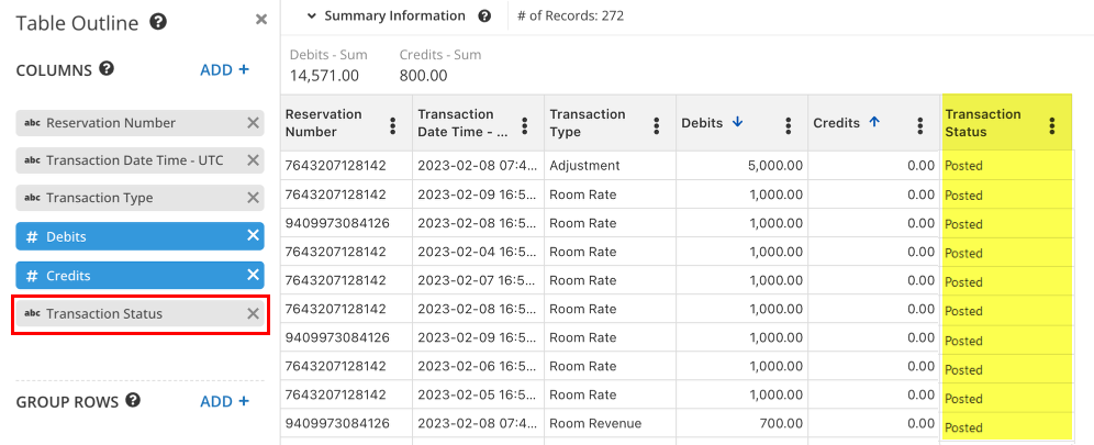 Cloudbeds Veri Alanı (CDF) İşlem Durumu olarak adlandırılır. İşlem Durumu CDF’si Tablo Taslağında etkinleştirildiğinde, raporda işlemin durumunu gösteren bir sütun görürsün: İşlendi veya Beklemede (örneğin, gelecekteki konaklama tarihine ait oda fiyatı).