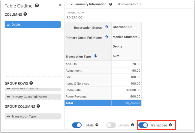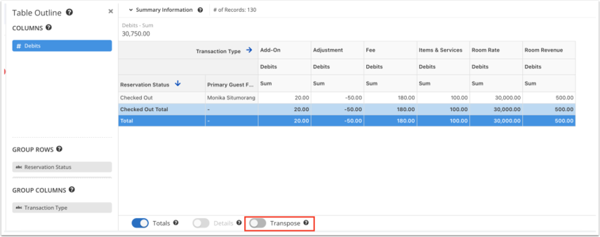 Aşağıda Cloudbeds Insights içinde bulunan Transpose özelliğinin açıklamasını bulabilirsin. Rapor üzerindeki Transpose geçiş düğmesine tıkladığında, veriler satırlardan sütunlara ve tam tersi şekilde dönecektir.