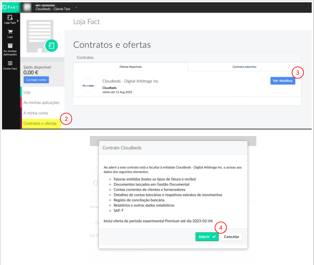 Aderire tıkladıktan sonra, şirketin Cloudbeds sözleşmesine kaydı tamamlanır. Şimdi sözleşmeli işlevlerin aktivasyonuna geçmen gerekiyor.