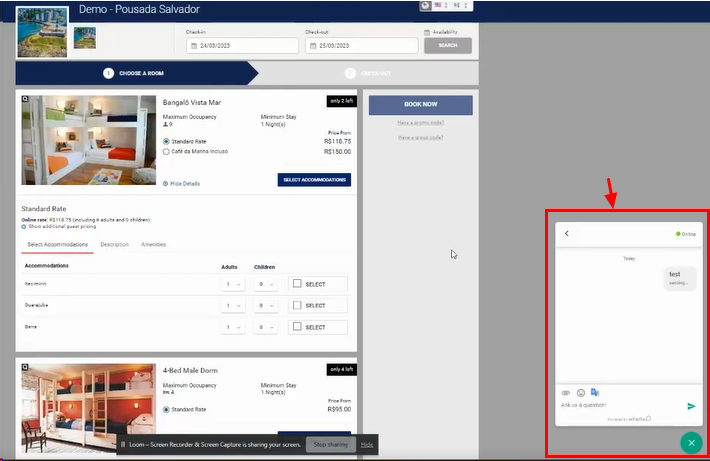 Canlı Sohbet Eklentisi, aşağıdaki örnekte olduğu gibi Cloudbeds Rezervasyon Motorunun rezervasyon sayfasında kullanılabilir olacaktır: