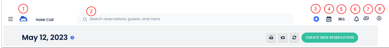 Sistemin her yerinden erişilebilen Üst Menü, günlük temel işlemleri hızlıca yapman için kısayollar içerir; örneğin bir rezervasyon oluşturmak veya Takvim erişmek gibi. |