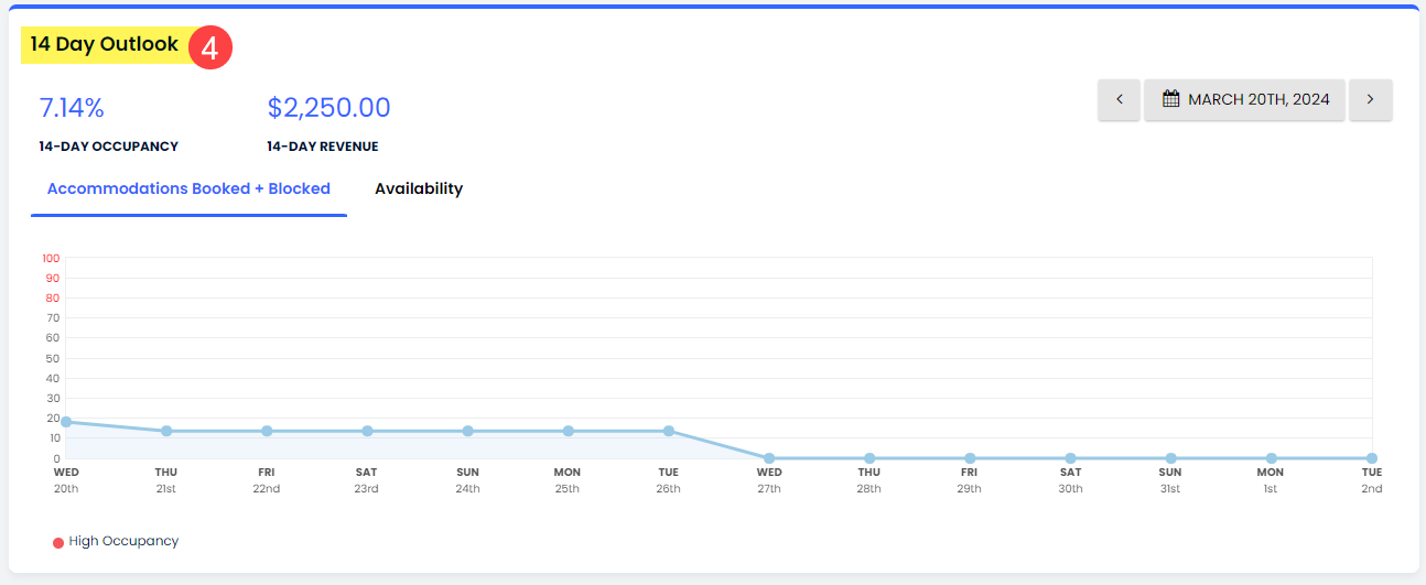 - 14 Günlük Görünüm, doluluk (%) ve gelir ($) için temel metrikleri gösteriyordu.