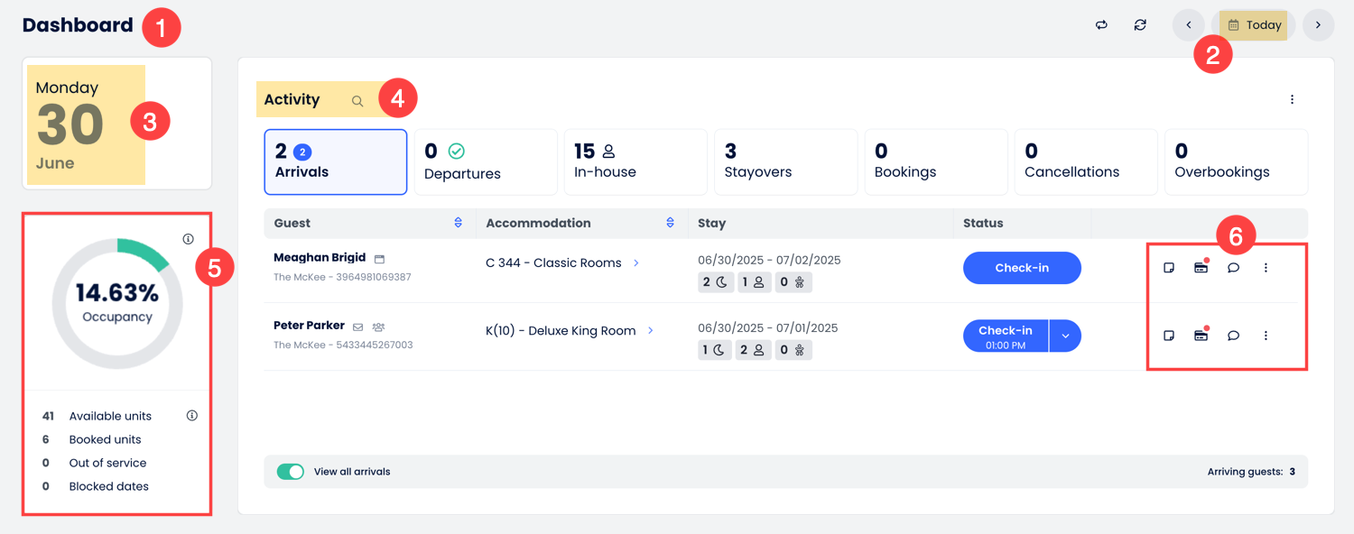 - Rezervasyonlar bölümü, gelişler, çıkışlar, devam eden konaklamalar ve konaklayan misafirler gibi temel misafir bilgilerini hızlıca gösteriyordu.