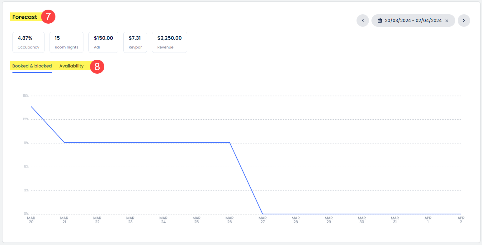- Öngörü bölümü, doluluk oranı, ADR, satılan oda geceleme sayısı ve daha fazlasını gösterir.