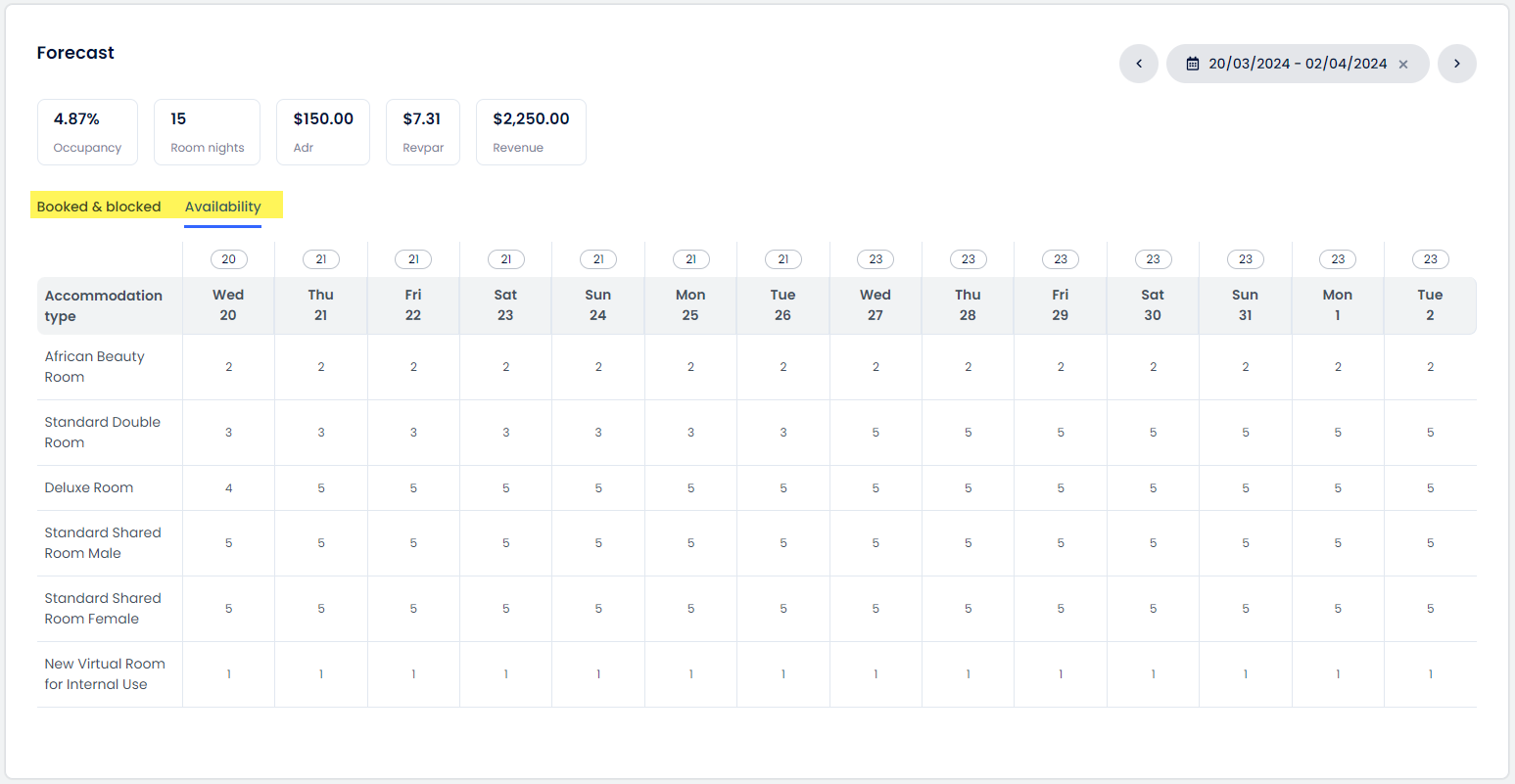 - Rezerve Edilen ve Engellenen odalar genel görünümünde ve Müsaitlik sekmesinde tesisin mevcut müsaitliğini görüntüleyebilirsin.