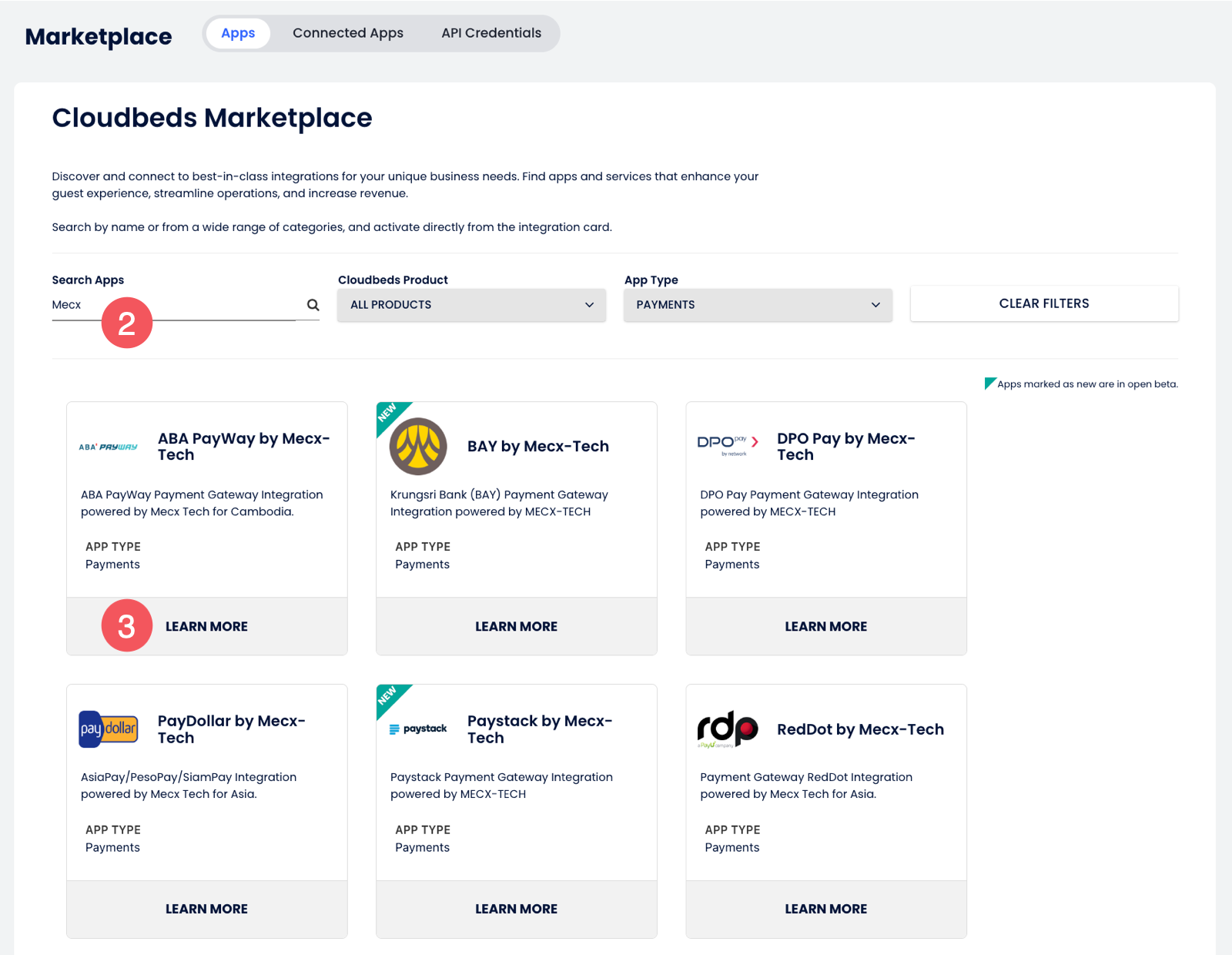 - Cloudbeds’e bağlanmadan önce, aşağıdaki Destek Makaleleri’ni kullanarak Ödeme Ağ Geçidi sağlayıcısıyla bir hesap oluşturma talimatlarını takip et. Zaten bir hesabın varsa, Mecx-Tech’in ihtiyaç duyacağı Üye İşyeri ID ve Gizli Anahtar bilgilerini almak için Destek Makalesi talimatlarını uygula.