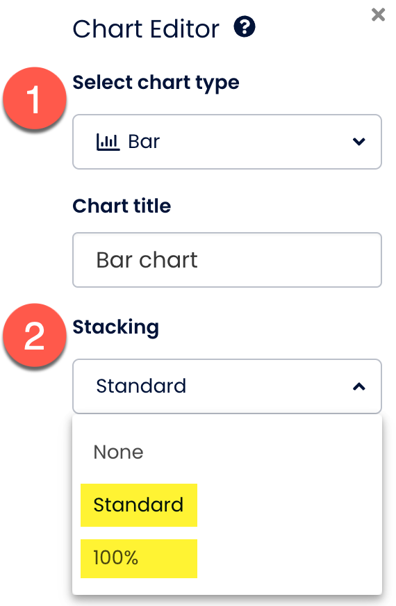- Yığma seçeneği altında, geleneksel yığılmış çubuk grafik için standart, normalleştirilmiş versiyon için %100 seç