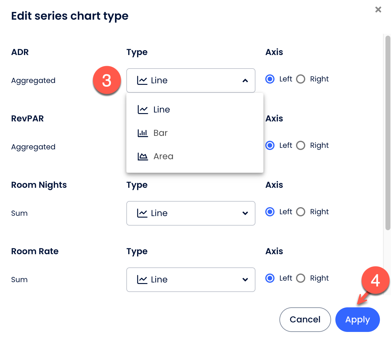 - Grafik rapora eklendikten sonra, dört Müsait tür arasında geçiş yapabilir ve serileri düzenleyebilirsin.