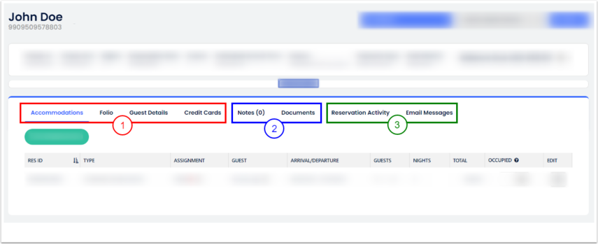 Rezervasyon Detayları Sayfası, misafirin rezervasyonunun tüm yönlerini sınıflandırmayı ve yönetmeyi kolaylaştırmak için farklı sekmeler halinde düzenlenmiştir: