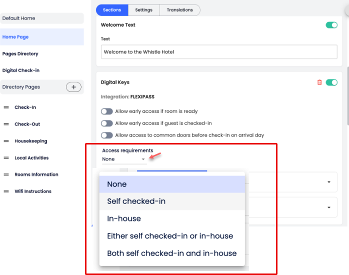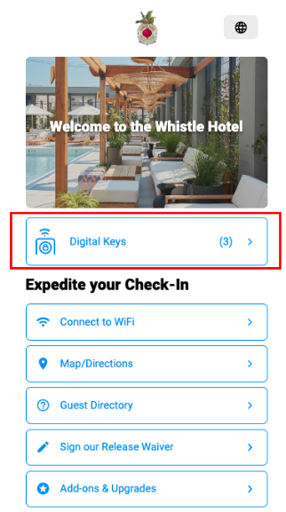 Webkeys, Cloudbeds Guest Experience Misafir Portalı'nda dijital anahtar düğmesi aracılığıyla misafirler tarafından erişilebilir hale gelecektir. Her misafir için bu düğmenin nasıl etkinleştirileceğini öğrenmek için bir sonraki adıma bak.