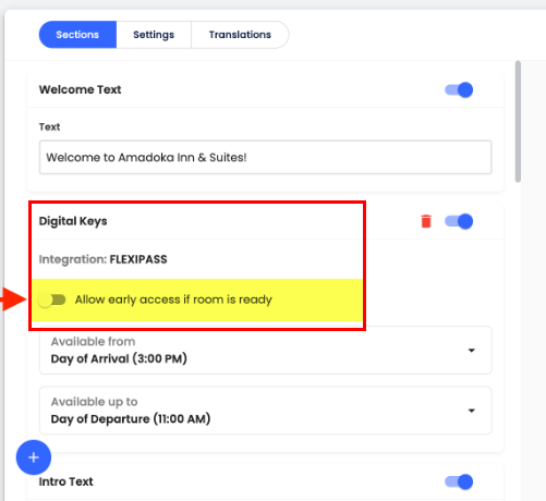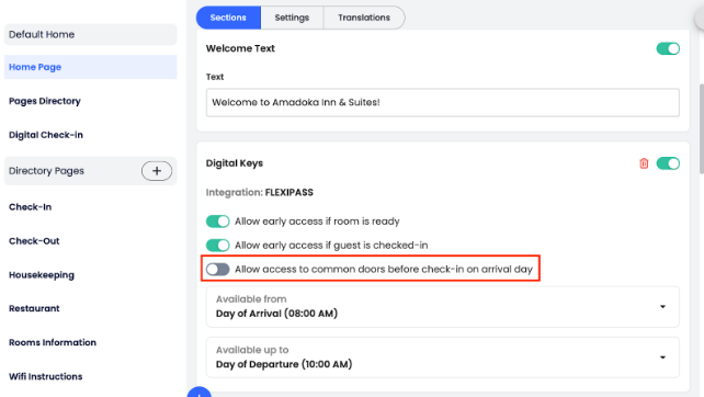 - Misafir uygulaması ana sayfasını yapılandırırken, oda hazırsa erken erişime izin ver seçeneğini açmak için geçiş düğmesini aktif hale getir.