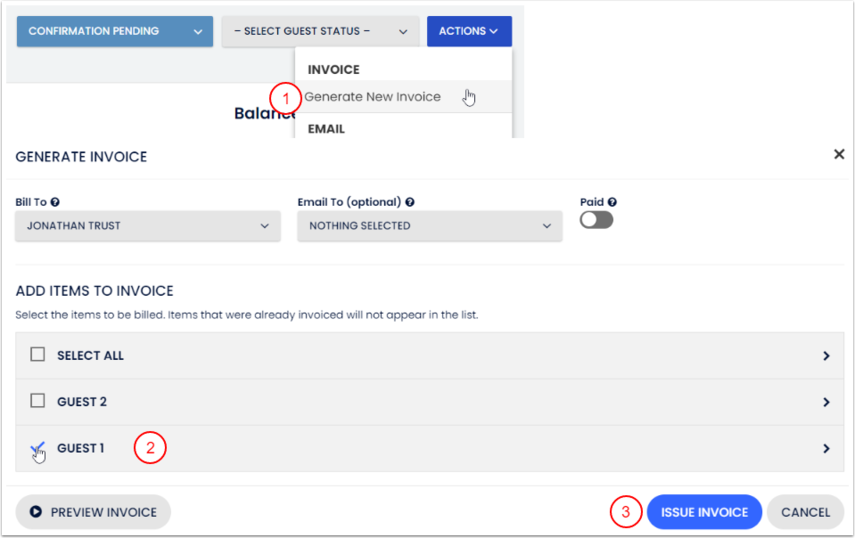 - Rezervasyon içinde İşlemlere tıkla ve Yeni fatura oluştur seçeneğini seç