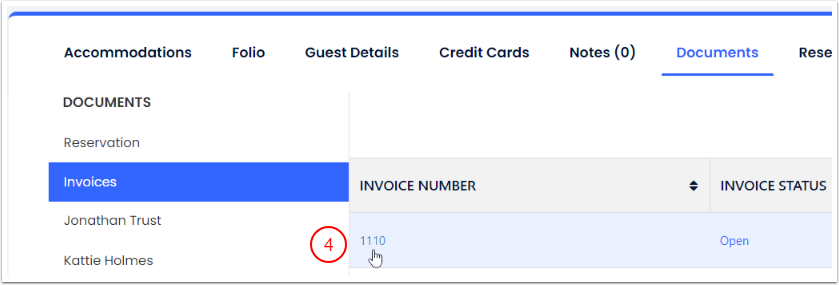 - Fatura, "Misafir 1 folyosu"na eklenen tüm işlemlerle oluşturulacak ve Belgeler sekmesinde görünecektir.