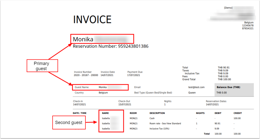 Faturanın üst kısmındaki Misafir Adı, her zaman rezervasyonun oluşturulduğu misafirin (birincil misafir) adını yansıtır. Başka bir fatura oluşturup işlemi ikinci bir misafire atadığında, misafir adı o işleme bağlı olur ve faturada buna göre görünür.