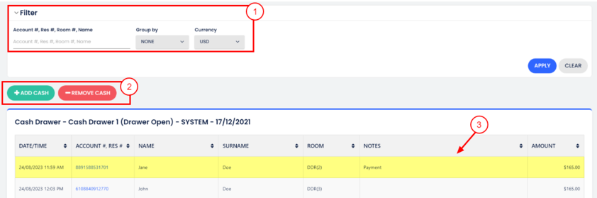2. Nakit ekle veya kaldır — miktarı ve isteğe bağlı notu belirt (rezervasyona bağlı değildir).