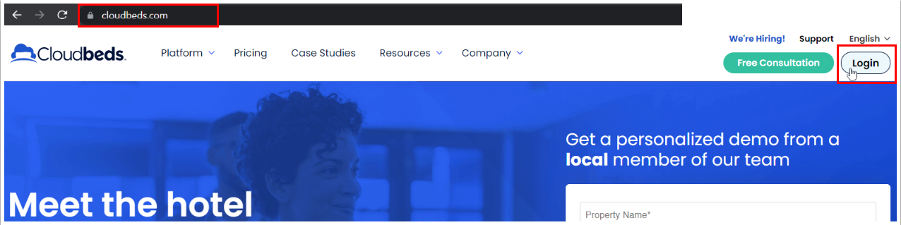 1. Cloudbeds web sitesine git ve ekranının sağ üstündeki giriş bağlantısına tıkla.