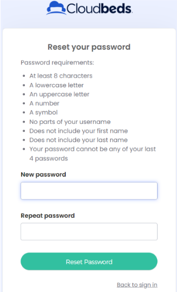 Cloudbeds kelimesi ve varyasyonları güvensiz kabul edilir. Sistem, bu kelimeleri içeren şifre oluşturulmasına izin vermez.