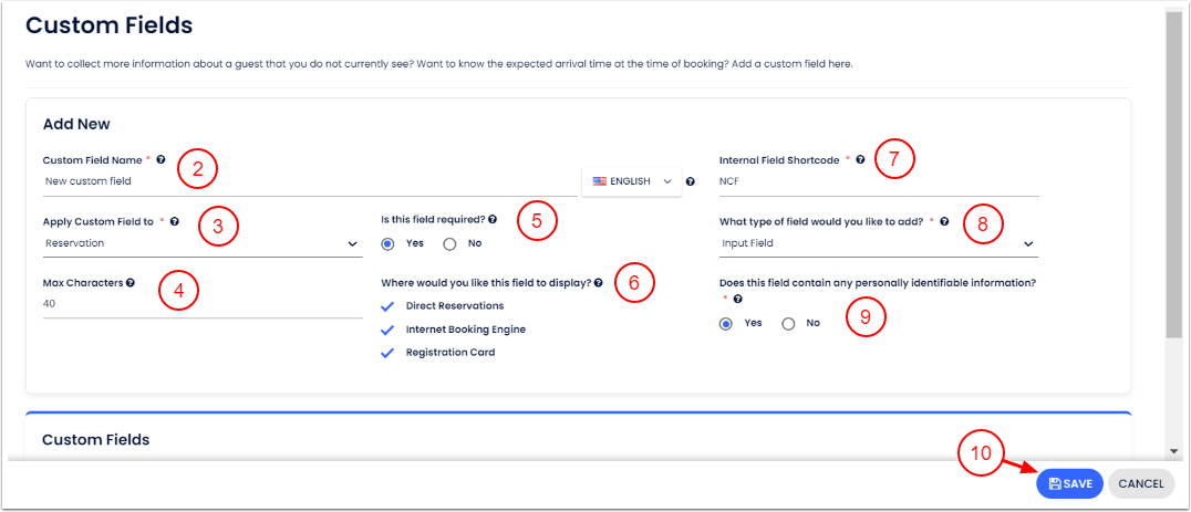 - Özel alanı uygula - Bu alanın rezervasyon veya misafir bilgi bölümünde yer almasını seç. Misafir veya Rezervasyon Genel Bakışında Özel Alanların nasıl bulunacağını gör