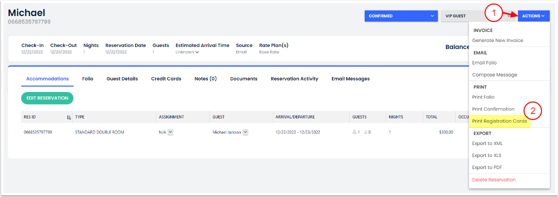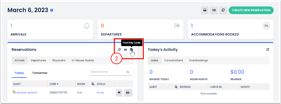 - Tamam butonuna tıkla. Bugünün girişleri için, her rezervasyonun ana misafirini içeren tüm kayıt kartlarının bulunduğu bir belge oluşturulacak.