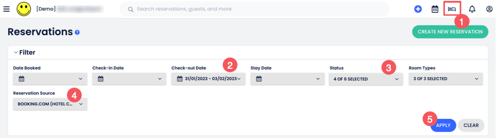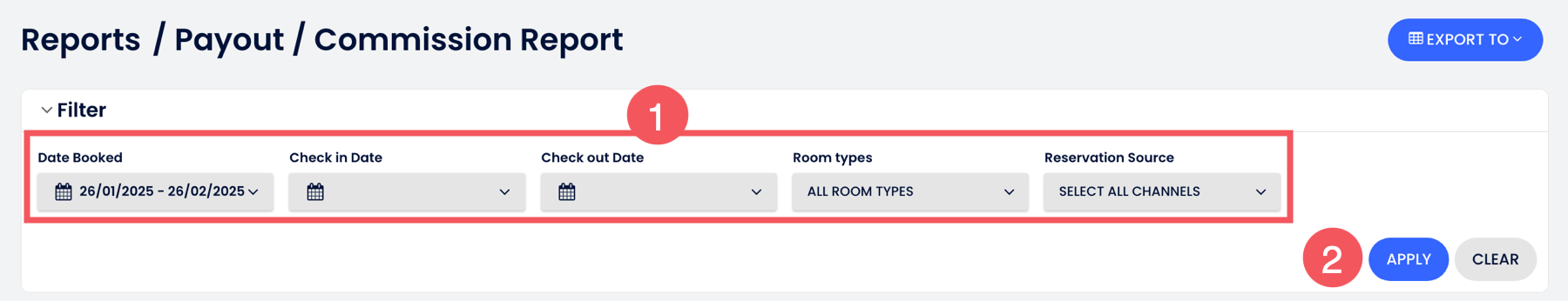 - Giriş veya Çıkış Tarihini seç (örn. Şubat başında Booking.com’a ne kadar komisyon ödenmesi gerektiğini öğrenmek istiyorsan, Ocak ayında çıkış yapan tüm rezervasyonların listesini almalısın).