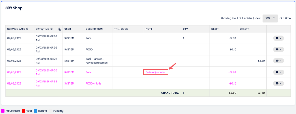 Öğe, tesis hesabı tablosunda görüntülenecektir. Eklendiği öğeyi geçersiz kılmak istersen, aşağıda gösterildiği gibi dişli simgesine tıkla ve ardından Geçersiz Kıl seçeneğine tıkla: