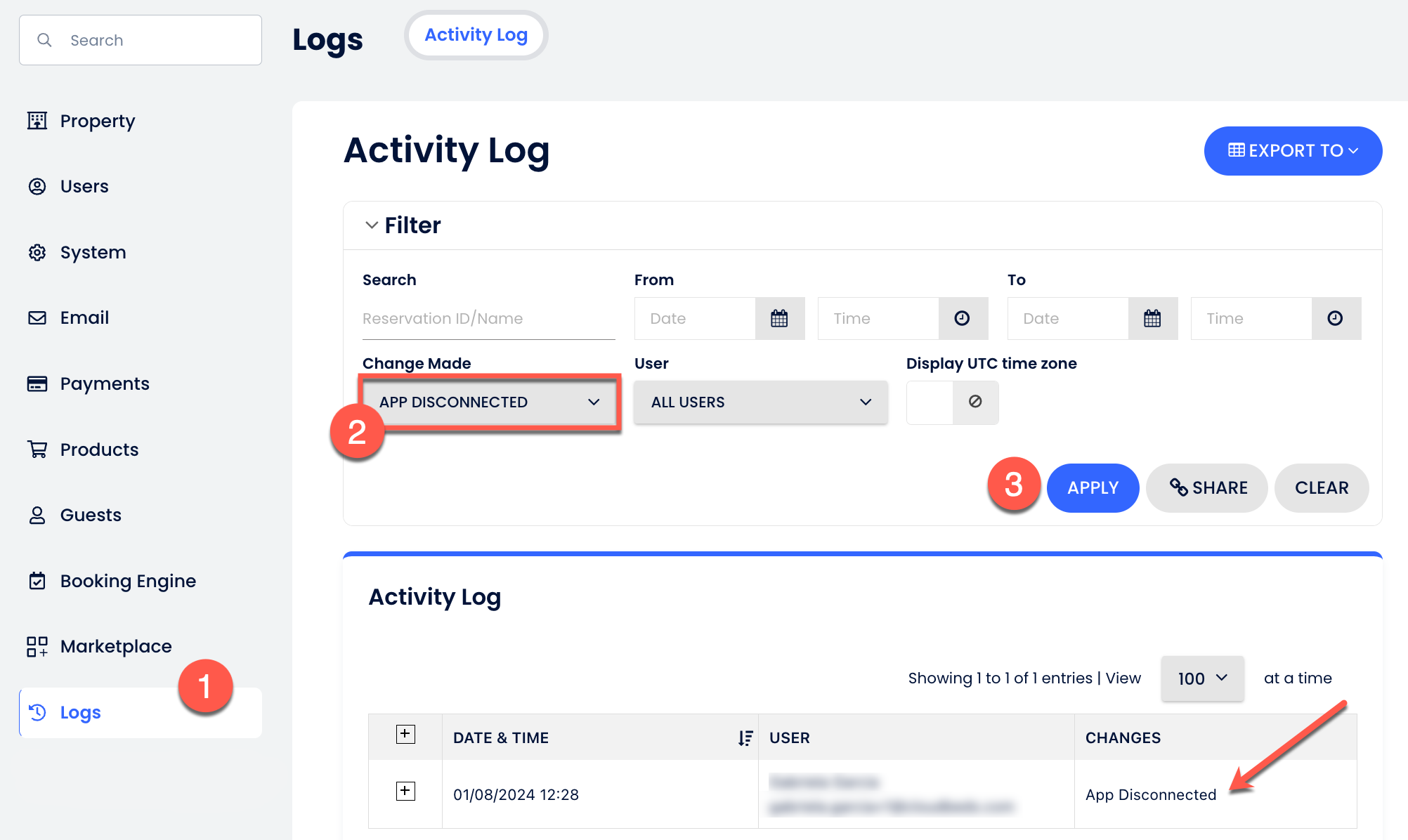 Bağlantının kesildiğini doğrulamak istersen, Günlükler > Etkinlik Günlükleri > Yapılan Değişiklik kısmında API ve Uygulamalar filtresi altında Uygulama Bağlantısı Kesildi filtresini uygula.