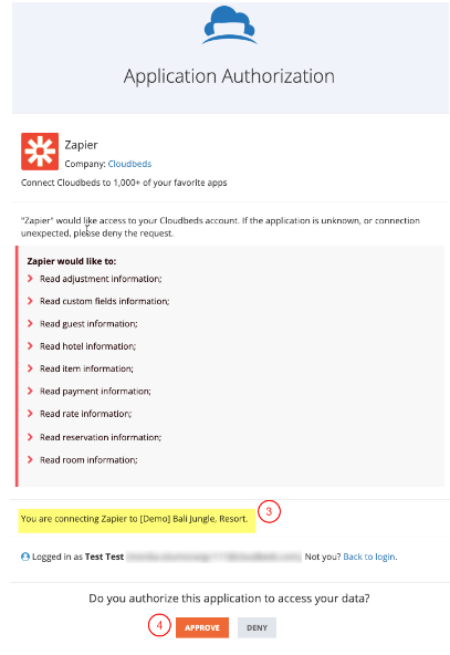 1. Bağlantıyı onaylaman için bir açılır pencere açılacak, doğru Cloudbeds hesabı olduğundan emin ol.