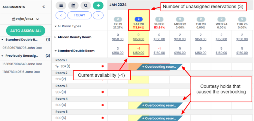 Tam dolu olduğunuzda ve atanmamış rezervasyonlarınız varsa, sistem kullanıcıların oda blokajı, geçici ayırtma oluşturmasına veya bir odayı hizmet dışı olarak ayarlamasına hala izin verir, bu da fazla rezervasyona yol açabilir (örn. beklenmedik bakım veya onarımlar).