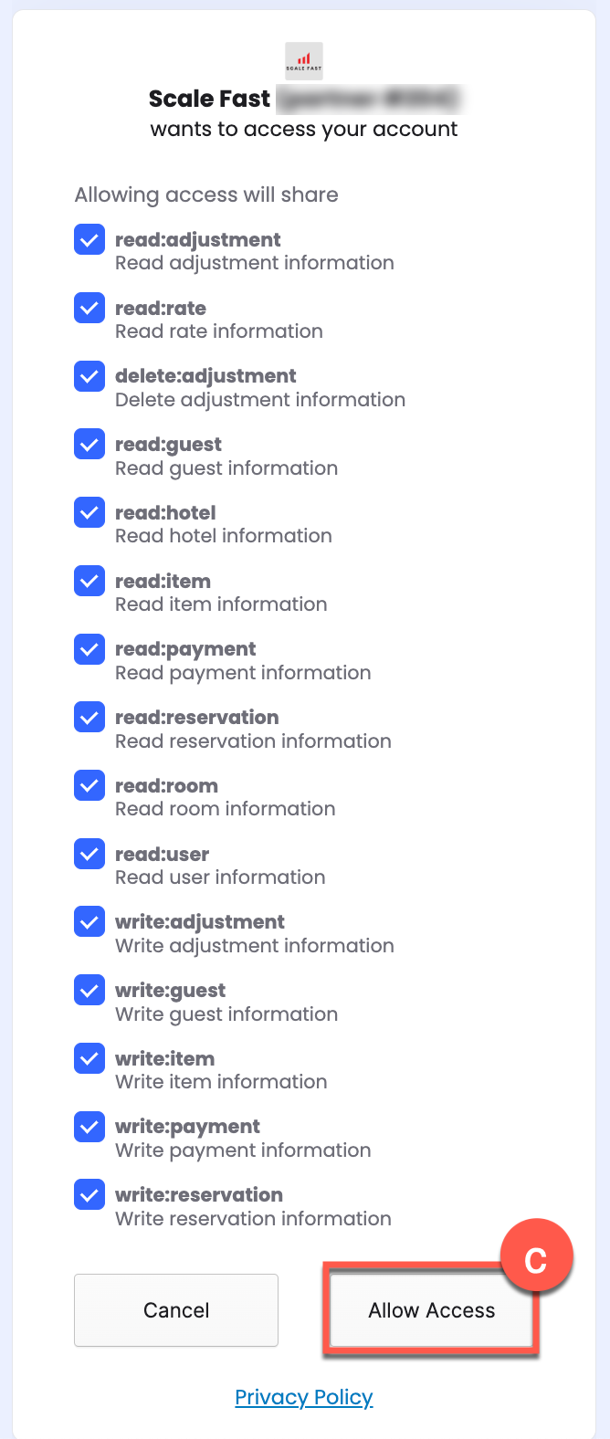 Uygulama Yetkilendirme sayfası, uygulamanın erişmek istediği izinlerin listesini gösterir. Bağlantıyı onaylamak için Erişime İzin Ver seçeneğine tıkla.