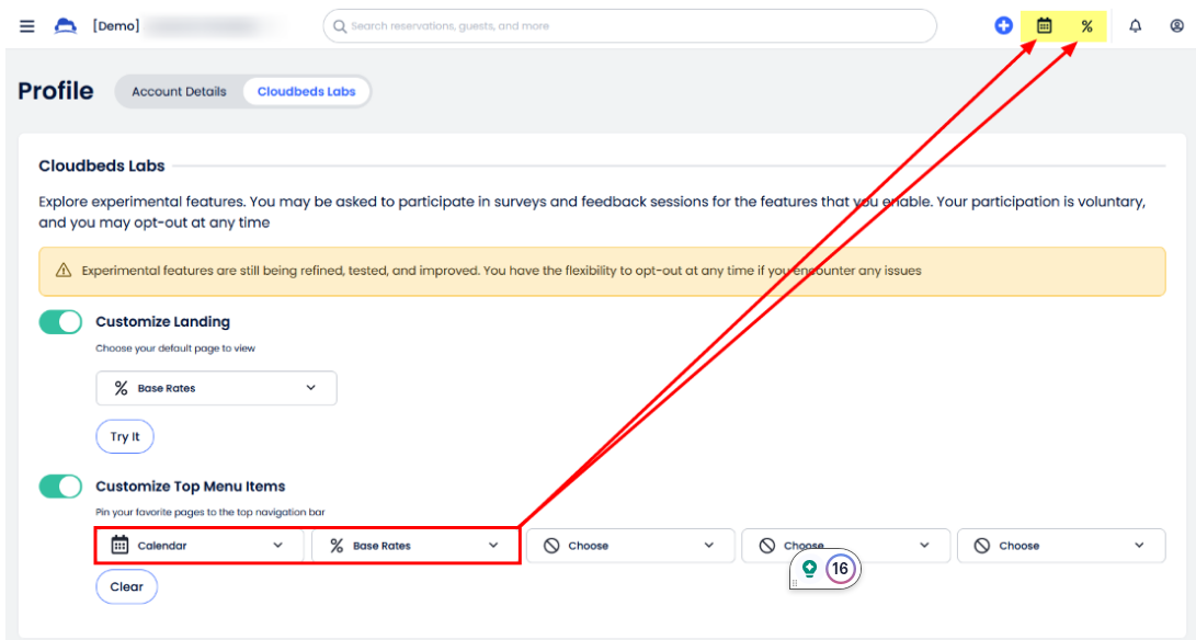 Cloudbeds PMS’in yaklaşan deneysel özelliklerinin bir parçası ol. Cloudbeds Labs, bu özellikleri kendi hesabında test etme ve ayrıca gezinme deneyimini özel ihtiyaç ve gereksinimlerine göre özelleştirme imkanı sunar.