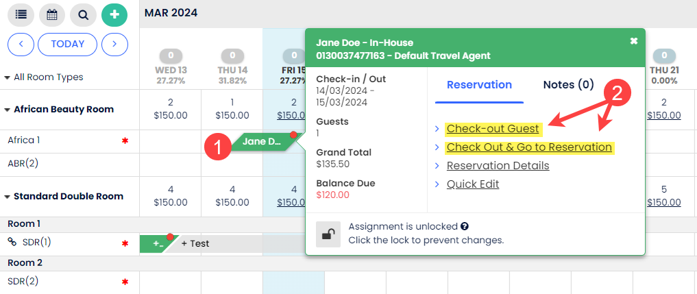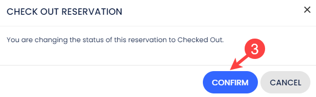 Rezervasyonun konaklama tarihleri Yöntem 1 veya Yöntem 2 ile erken çıkış tarihini yansıtacak şekilde başarıyla güncellendikten sonra, misafirin çıkış işlemini gerçekleştirebilirsin.