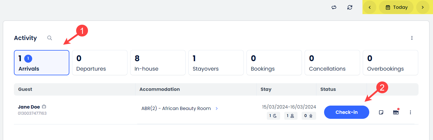 - Bir misafiri yalnızca varış tarihi bugünün tarihi veya geçmiş bir tarih ise giriş yapabilirsin.