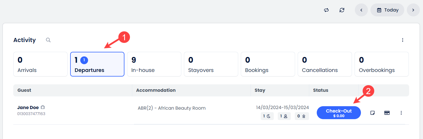 - Bir misafirin rezervasyonunu yalnızca çıkış tarihi bugünün tarihi veya geçmiş bir tarih ise çıkış yapabilirsin.
