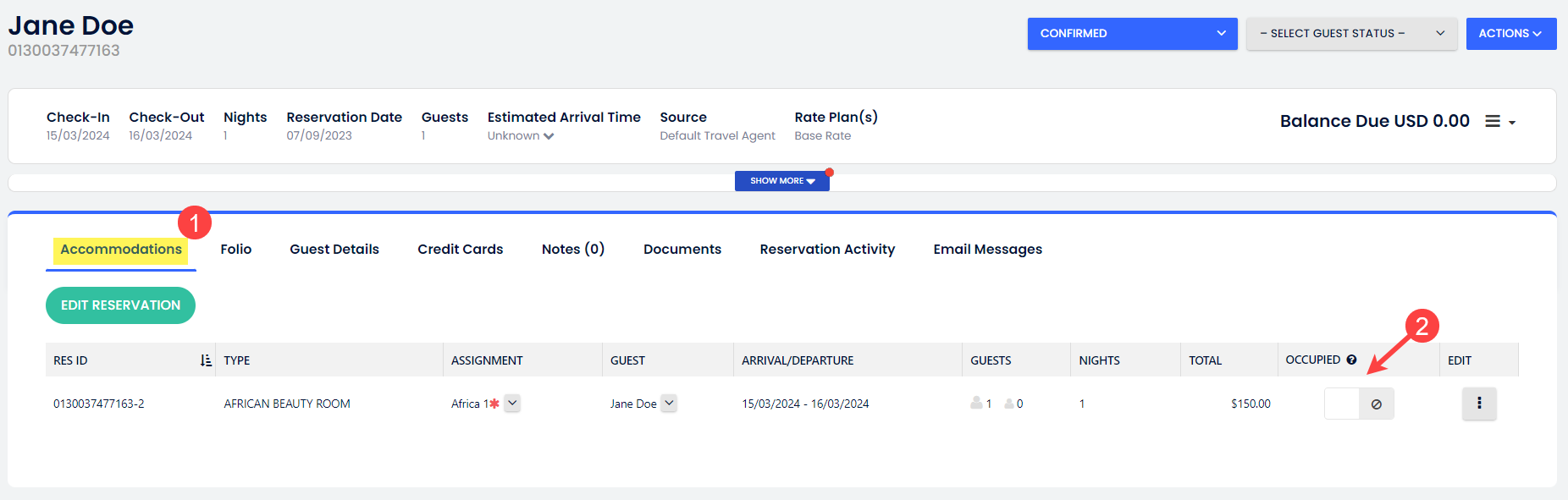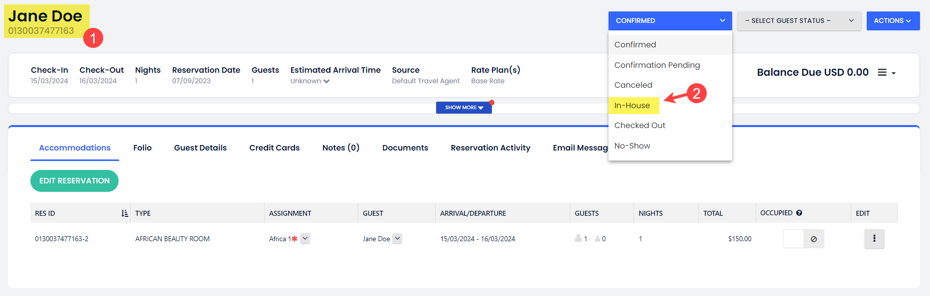 - Rezervasyon durumunu Konaklayan olarak değiştir.