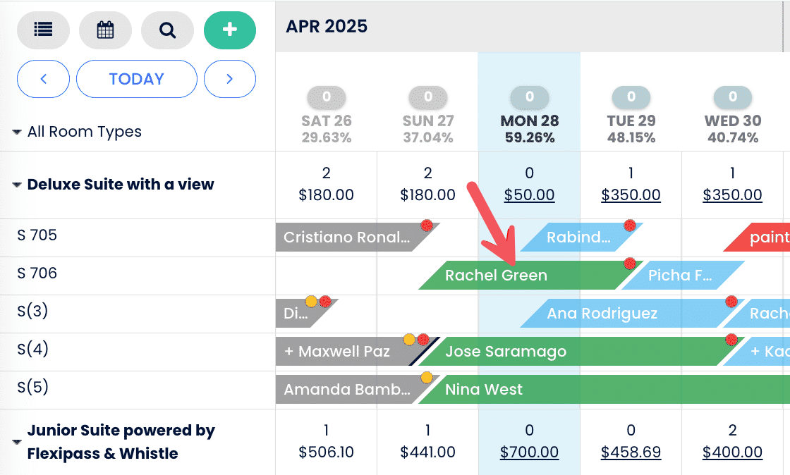 Kaydettikten sonra, takvimdeki rezervasyon çubuğu yeni çıkış tarihini yansıtacak şekilde görsel olarak kısalır.