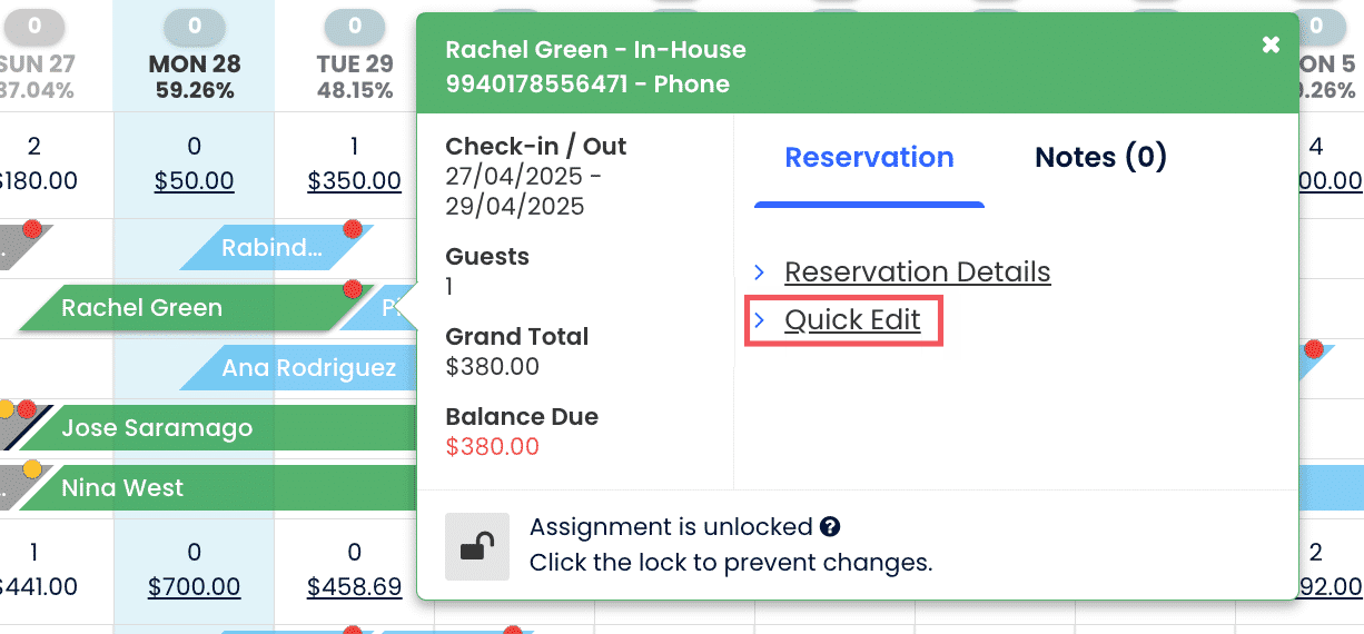 2. Rezervasyon açılır penceresinden "Hızlı Düzenle"ye tıkla.