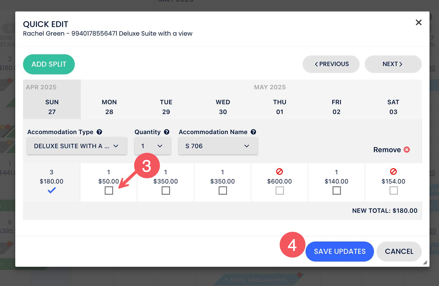 3. "Hızlı Düzenle" takvim görünümünde, misafirin artık konaklamayacağı her gece için kutunun seçimini kaldır.