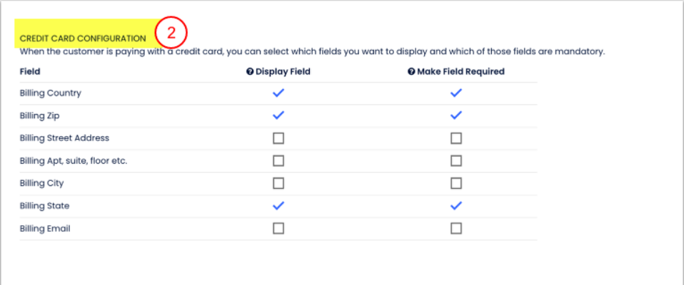 - Fatura adresi gereksinimlerinin nerede görüneceğini seçtikten sonra, kredi kartı yapılandırmalarını ayarlaman için başka bir seçenek açılacaktır.