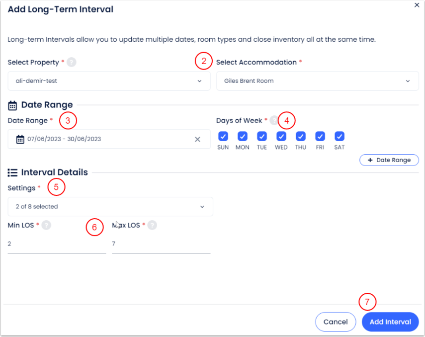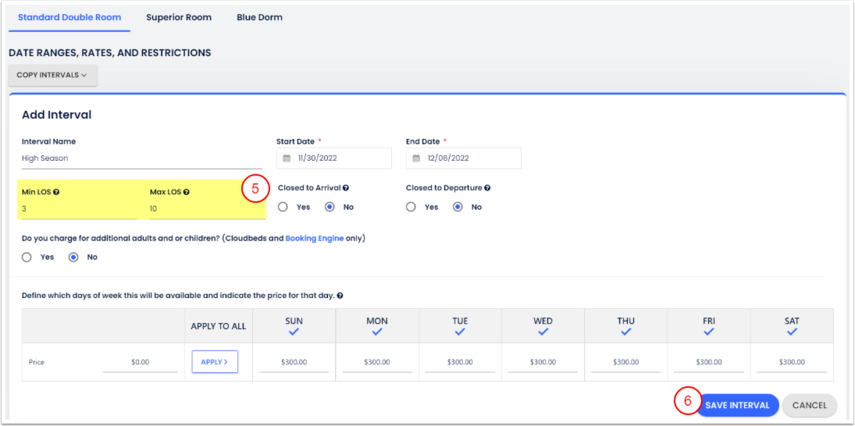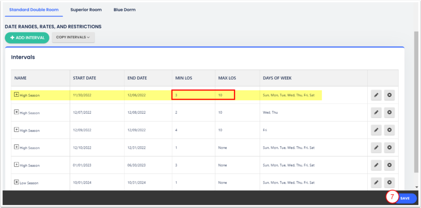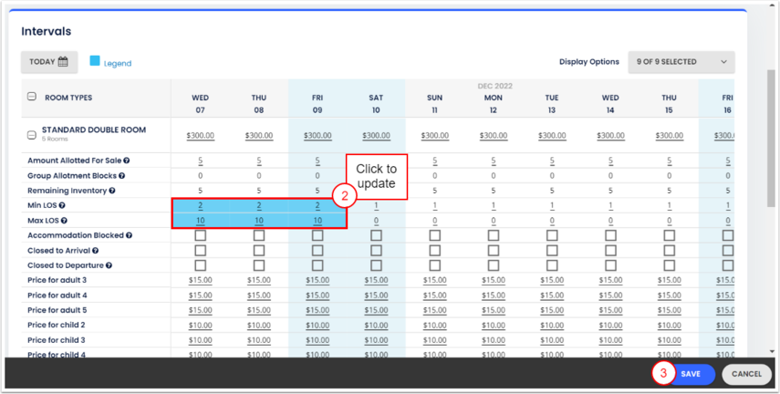 - Konaklama(lar)/tarih üzerine tıkla ve kısıtlama için gece sayısını gir. Güncellenen tarihler, kaydedilecek değişiklikleri göstermek için vurgulanacaktır.
