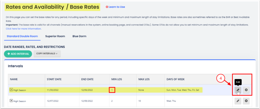 Müsaitlik Matrisi, tek bir gün veya tam bir tarih aralığı ekleyerek müsaitlik ve kısıtlamaları görsel olarak güncellemeni sağlar. Taban Fiyatlarına MinLOS veya MaxLOS kısıtlamaları eklemek için aşağıdaki adımları takip et:
