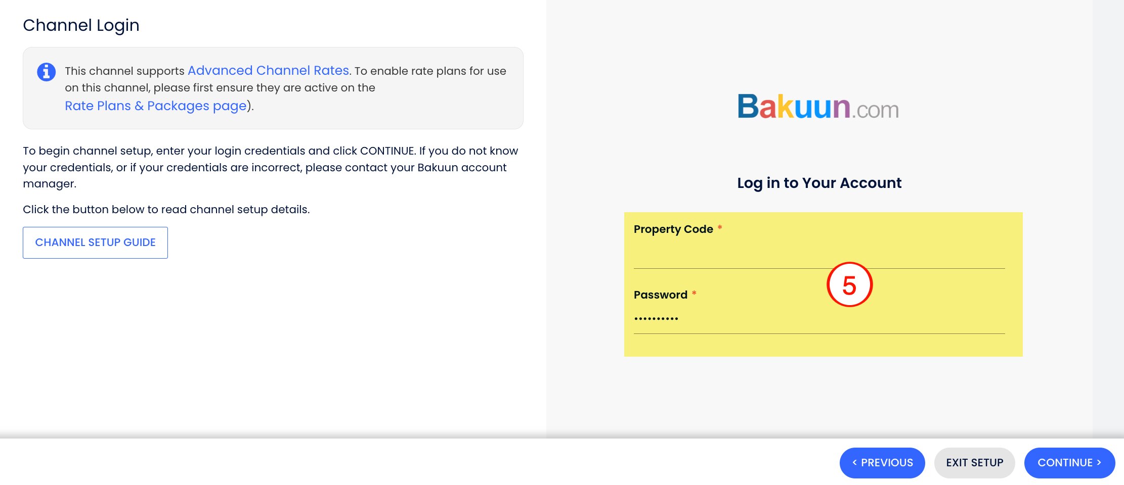 1. Çoğu kanal, bağlanmak için belirli kimlik bilgileri (Otel ID'si, Otel Anahtarı, Şifre, e-postalar, Hesap numarası) ister. Kanal tarafından önceden sağlanan kimlik bilgileri ile formu doldur ve giriş yap.