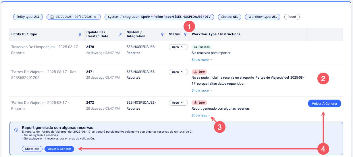 • Manuel yükleme iş akışı (Carga Masiva) kullanıyorsan, veri sorunlarını düzelttikten sonra dışa aktarma dosyalarını yeniden oluştur seçeneklerini görebilirsin (4)
