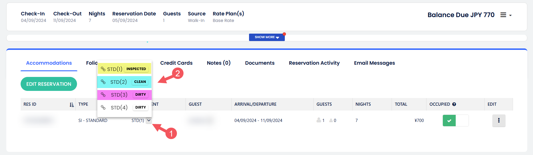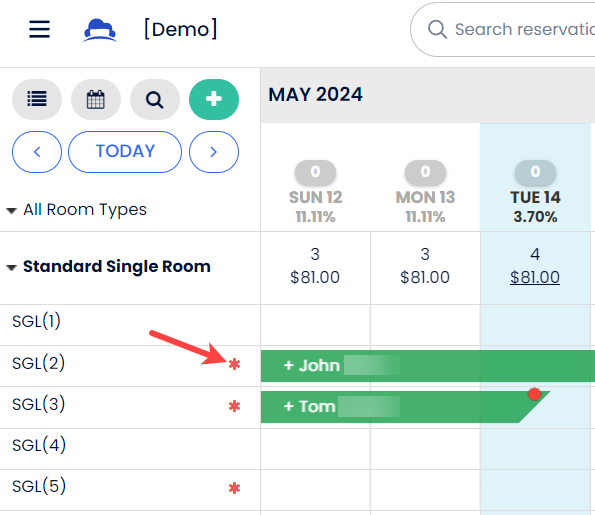 Rezervasyon detayları sayfasında, odanın kirli durumda olduğunu göstermek için atanan odanın yanında kırmızı yıldız işareti* görünür: