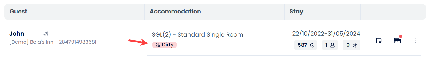 Oda durumu kirli olduğunda, Cloudbeds PMS Kontrol Panelinde böyle görünür: